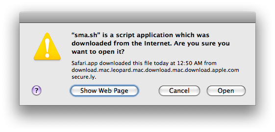 The attacker just needs to own "comsecure.ly" for this to work. To make this screenshot I put "127.0.0.1 download.mac.leopard.mac.download.mac.download.apple.comsecure.ly" in my /etc/hosts file, but someone who owned "comsecure.ly" could attack people this way. Apple Radar: 8191206