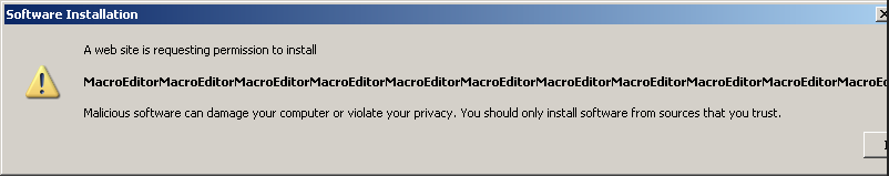 You might remember this dialog from the dark days of IE's dominance. The dialog includes the company's name, which is verified by a certificate authority, and the name of a program, which is whatever the site wants. Screenshot from Nick Lockard.