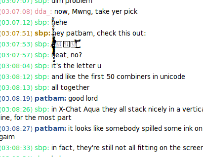 Unicode Combining marks can do strange things depending on your text rendering engine. (Accents, umlauts, especially heavy metal umlauts.)